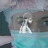 A futuristic doctor with syringe withdraws a liquid medicine and appears a hologram of a planet