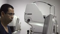 Asian doctor at work during eyesight exam to adult woman in hospital. Dolly shot