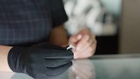 Closeup of female jeweller working at glass counter and giving woman silver ring with diamond to try on