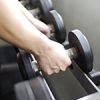 / Female model doing workout in a gym using dumbbells in standing position then sitting in a bench and checking her iPhone