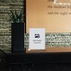 Print image mockup of a clear acrylic paper holder on a black marble reception lobby desk