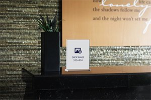 Print image mockup of a clear acrylic paper holder on a black marble reception lobby desk quantity