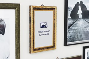 / Print image mockup of a golden frame hung on a wall and surrounded by other frames with photographs
