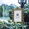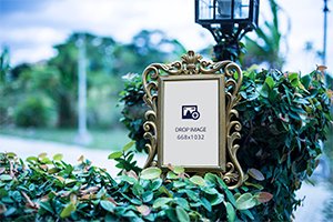 Print image mockup of a whimsical gold frame propped against an outdoor lamp and surrounded by leaves quantity