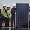 The group of people standing and holding a solar energy panel while looking at camera between row of panels on solar farm. Main engineer explain how to setup panels using laptop