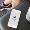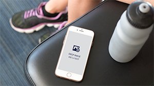 White iPhone 6S image mockup of an Apple phone on a workout bench beside a gray water bottle and rubber shoes at the gym