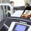 Young female model running in a treadmill in a gym and checking her iPad
