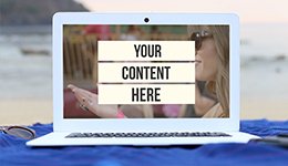 White Windows Laptop Demo Video Mockup of Sunglasses on a Blue Blanket by the Beach Shore Near the Ocean or Sea