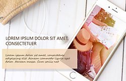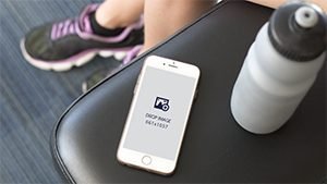 White iPhone 6S image mockup of an Apple phone on a workout bench beside a gray water bottle and rubber shoes at the gym