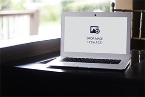 White laptop mockup of a Windows computer being used at an outdoor restaurant